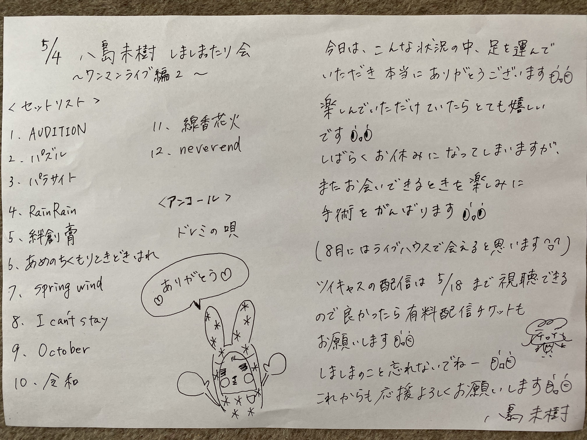 ライブ終了後に貰ったセットリストのフライヤー。